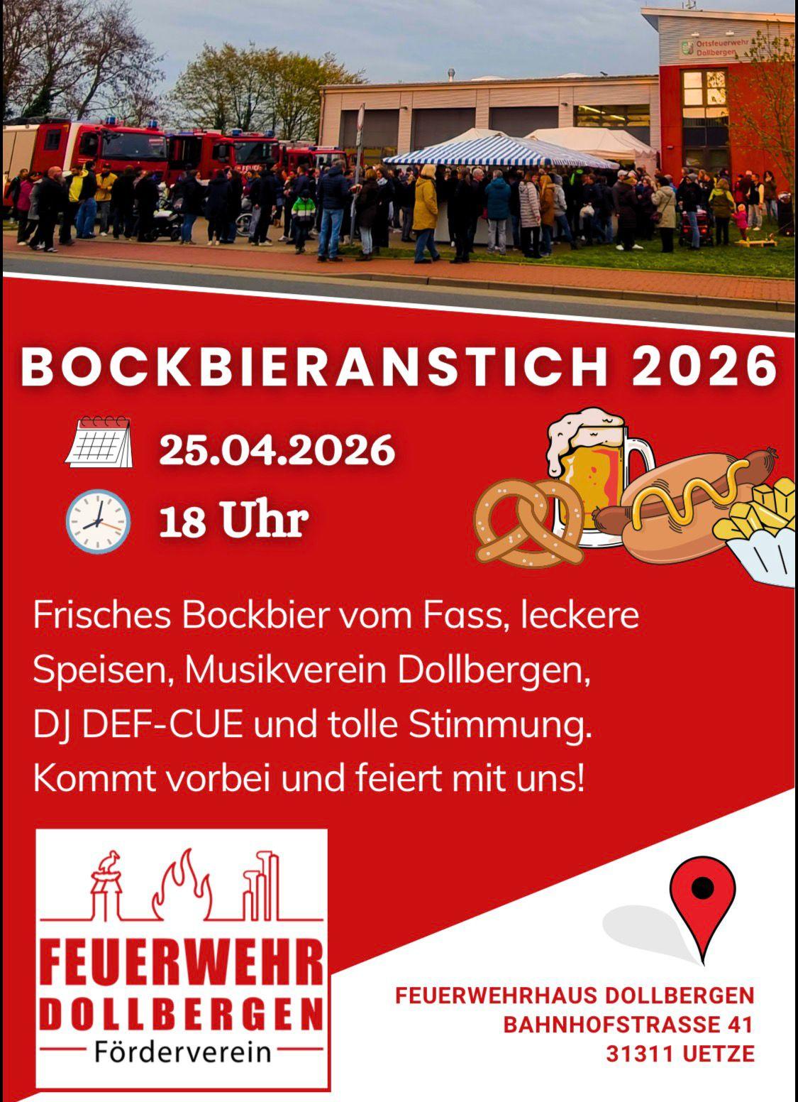 Am 25.04.2026, um 18:00 Uhr ist es endlich wieder so weit: der Förderverein der Feuerwehr Dollbergen lädt zum Bockbieranstich ein!