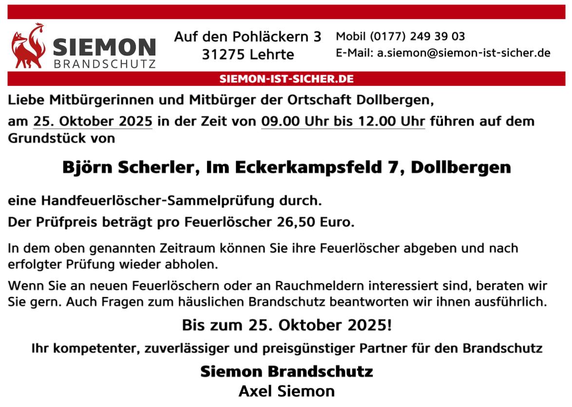 Die diesjährige Überprüfung der Handfeuerlöscher wird durch die Firma Siemon Brandschutz durchgeführt. Unser 1. Vorsitzender stellt hierfür gerne sein Grundstück zur Verfügung.